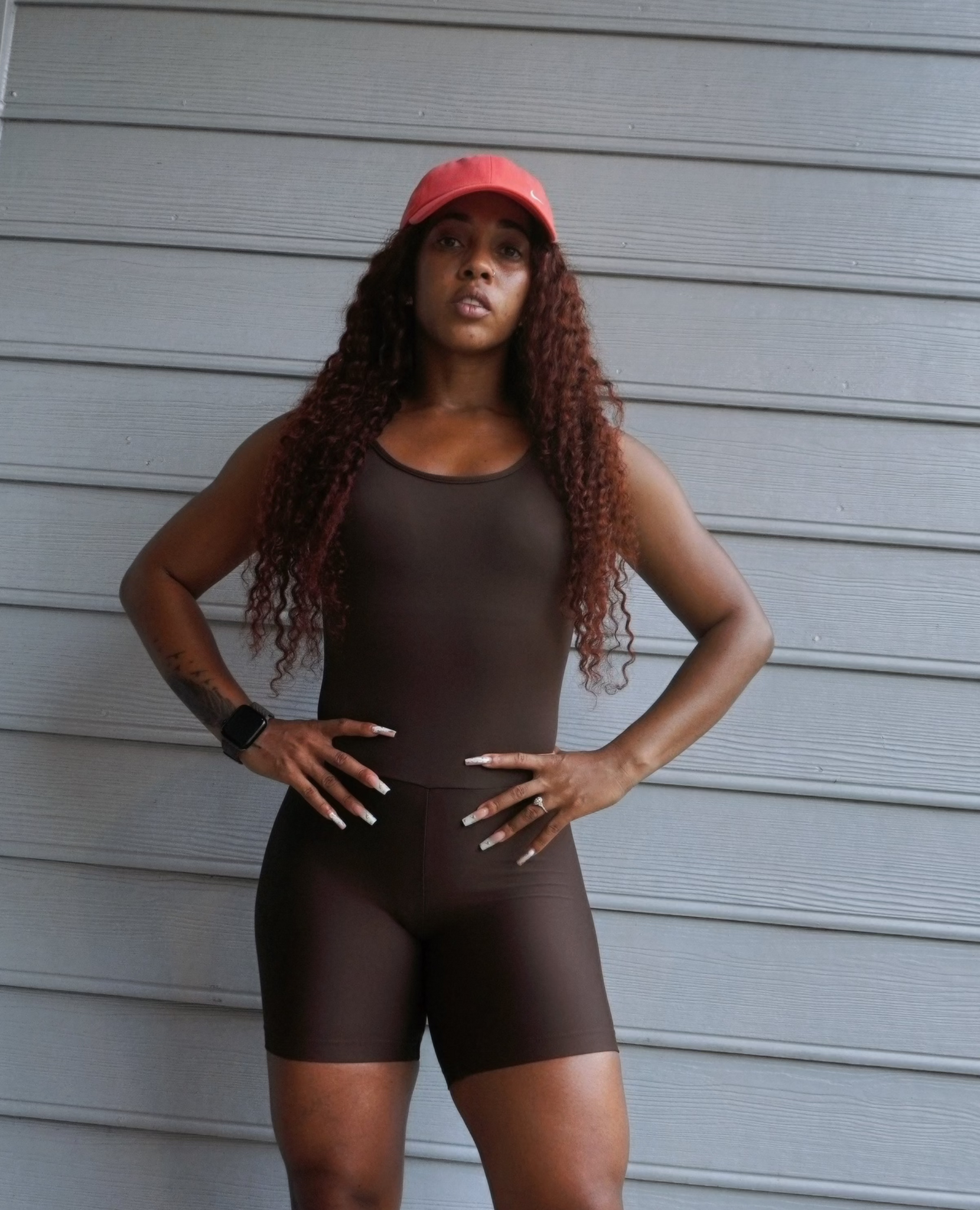 Poder Fit – the sexy open-back romper that proves strong girls can be sweet too. This rich brown piece was designed to hug your curves, show off your back, and keep up with every move.